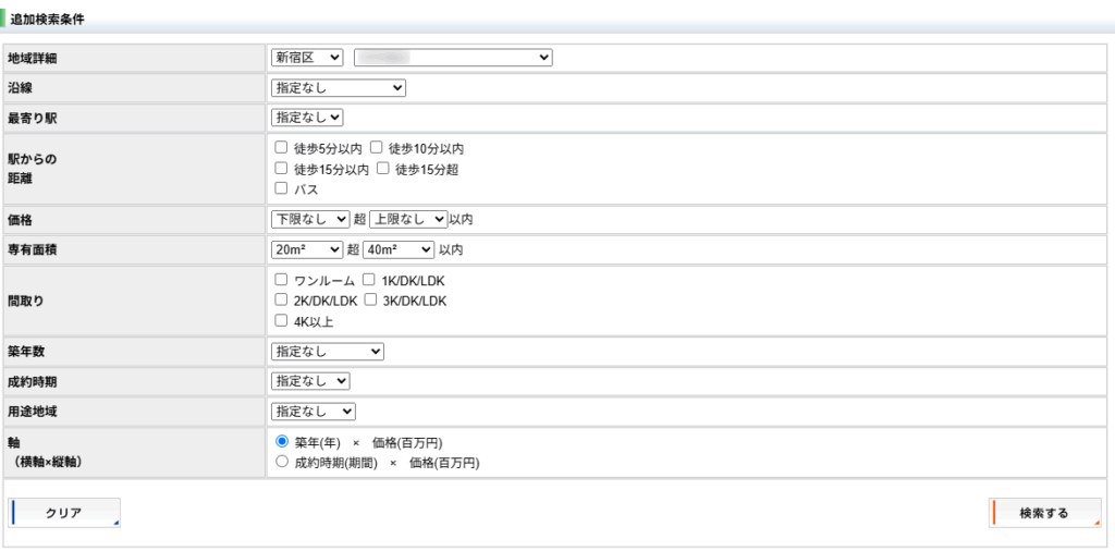 あまり条件を設定しすぎるとヒットしないので、価格に大きく影響しそうな場所と広さで検索しました